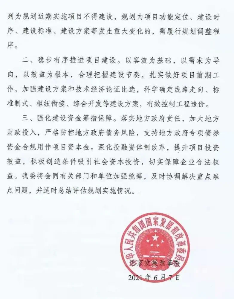 1、加强《规划》指导和约束。准确把握不同层次轨道交通的功能定位,严格按照相关技术标准合理确定规划建设方案,未列为规划近期实施项目不得建设,规划内项目功能定位、建设时序、建设标准、建设方案等发生重大变化的,需履行规划调整程序。2、稳步有序推进项目建设。以客流为基础,以需求为导向,以效益为根本,合理把握建设节奏,扎实做好项目前期工作,加强建设方案和技术经济论证比选,科学确定线路走向、标准制式、枢纽衔接、综合开发等建设方案,有效控制工程造价。3、强化建设资金筹措保障。落实地方政府责任,加大地方财政投入,严格防控地方政府债务风险,支持地方政府专项债券资金合规用作项目资本金。深化投融资体制改革,提升项目投资效益,积极创造条件吸引社会资本投资,切实保障企业合法权益。