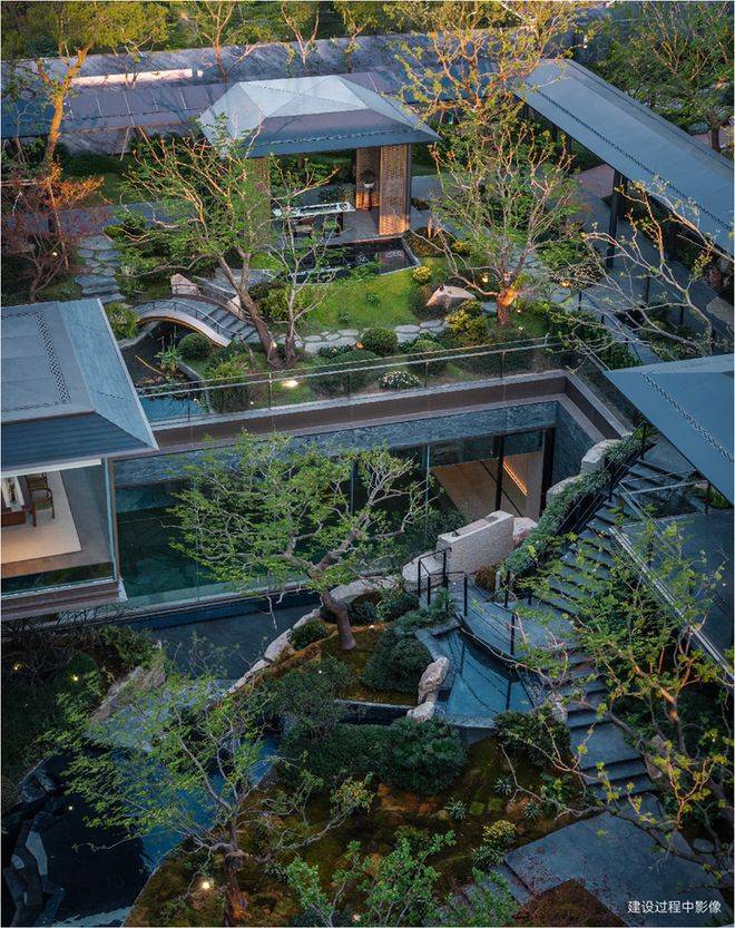 而最令人惊艳的,当属约6米地势差打造的下沉式山水庭院,山、石、水、林有序交织,犹如一幅“豁然开朗”山水轴卷,每一步皆是景致,每一处皆有不同。