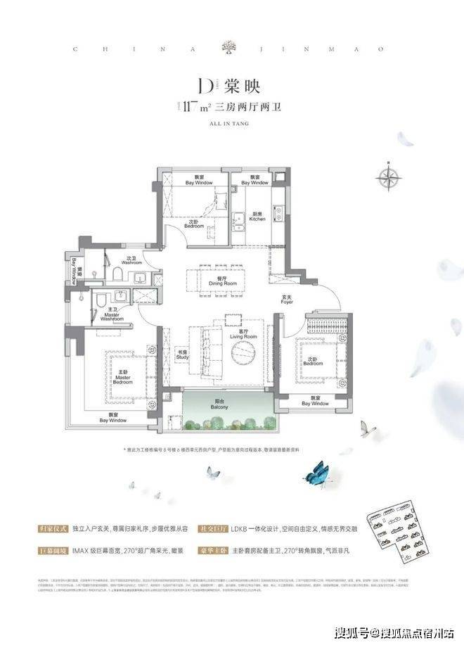 建面约117㎡3房2厅2卫,做到了3+1开间朝南+5个飘窗+主卧套房设计+270°转角飘窗,所有的尺度都有进一步提升。