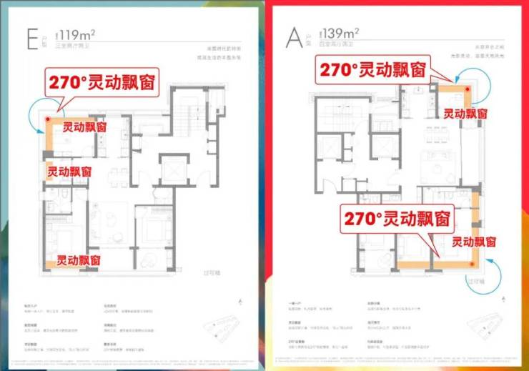 边套标配270°无柱飘窗,部分南北双270°飘窗。特别建面约139㎡户型,大阳台+满飘窗的组合,直接打开全景舱视野。