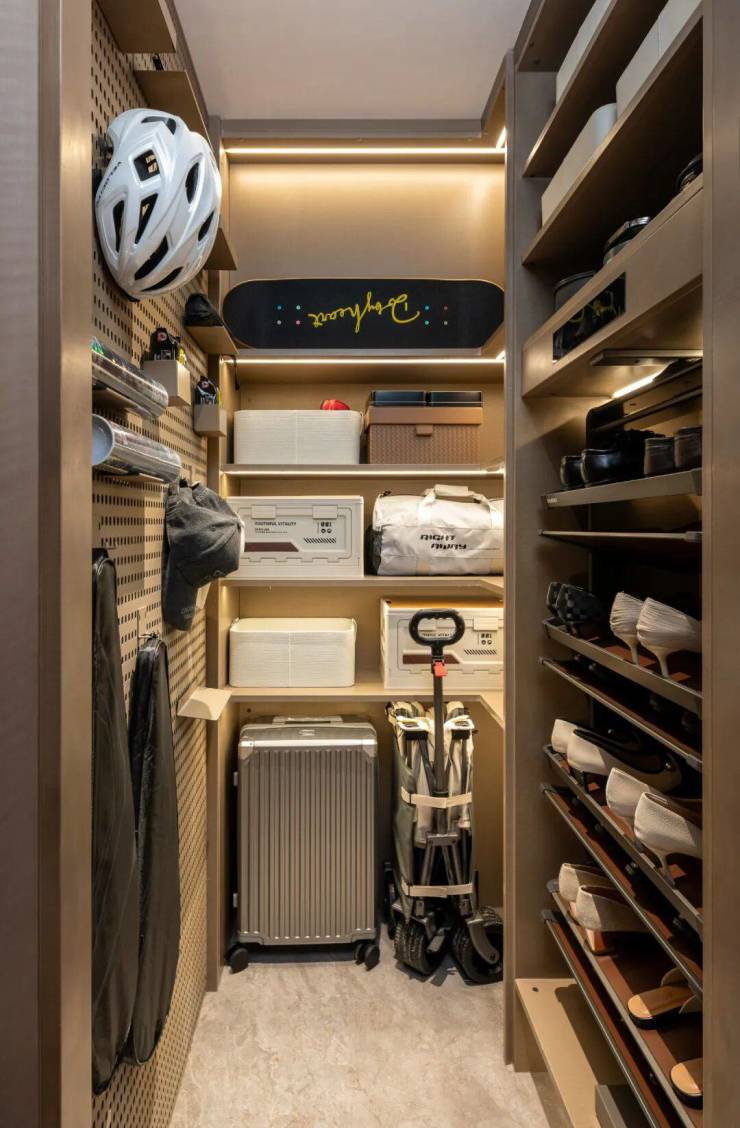 入户设计了800库,日常穿的鞋子、进门要换的外套可分类存放,不常用的医药箱、孩子的滑板、老人的拐杖也能各归其位。