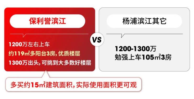 一方面,杨浦滨江1200-1300万级预算,多数只能将就105㎡紧凑3房;如今在保利誉滨江,不仅可多买15平米建筑面积,实际使用面积更“超预期”,还能锁定更好的楼层。