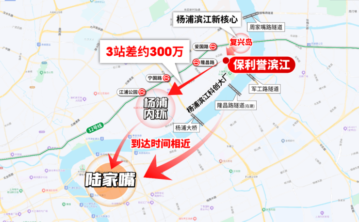 意味未来在复兴岛工作的大量人群,无法在岛内实现居住需求,必须向外寻求高品质住宅——而保利誉滨江,正是杨浦滨江所有新盘中距离复兴岛最近的项目(直线复兴岛约300米),自然成为复兴岛居住需求外溢的“第一站”。