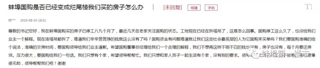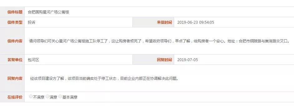 回复内容重点:因国购公司与相关金融机构存在债务纠纷,导致目前全面复工进程难以推进,中建七局表示此债务问题解决后才予正式全面复工。对此,国购公司表示正协同淮上区政府安排专人同该金融机构对接协调,争取早日全面复工,维护购房者利益,若出现延期交付的情况,国购公司将按照合同约定赔付违约金。