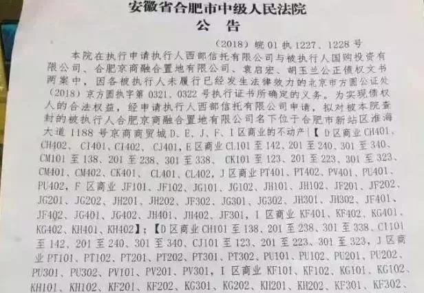 2018年12月合肥市中级人民法院就发出公告,京商商贸城5000多户商铺将被评估、拍卖。国购将其自持区的房子全部登记抵押了!