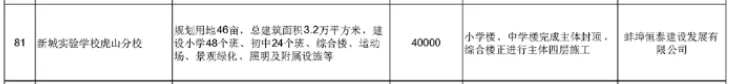 新城实验学校虎山分校建设内容和规模:规划用地46亩,总建筑面积3.2万平方米,建设小学48个班,初中24个班,综合楼,运动场、景观绿化、照明及附属设施等;总投资:40000万元项目进展情况:小学楼,中学楼完成主体封顶,综合楼正进行主体四层施工;