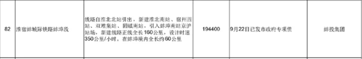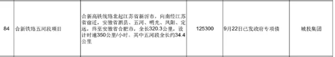 合新铁路五河段项目建设内容和规模:合新高铁线路北起江苏省新沂市,向南经过江苏省宿迁市,安徽省泗县、五河、明光、凤阳、定远终至安徽省合肥市;总投资:125300万元项目进展情况:9月22日已发政府专项债;