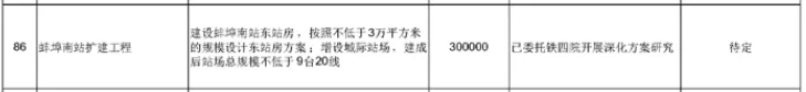 蚌埠南站扩建项目建设内容和规模:建设蚌埠南站东站房,按照不低于3万平方米的规模设计东站房方案,增设城际站场,建成后战场总规模不低于9台20线;总投资:300000万元项目进展情况:已委托铁四院开展深化方案研究;
