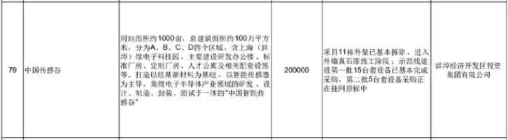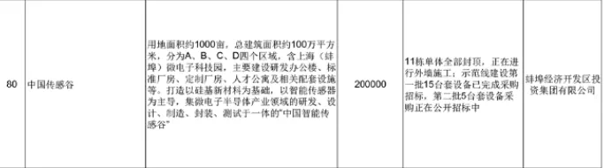 中国传感谷项目建设内容和规模:用地面积约100亩,总建筑面积约100万平方米,分为A/B/C/D四个区域,含上海(蚌埠)微电子科技园,主要建设研发办公楼、标准厂房、定制厂房、人才公寓及相关配套设施等;打造以硅基础材料为主导,集微电子半导体产业领域的研发,设计、制造、封装,测试于一体的“中国智能传感谷”总投资:200000万元项目进展情况:11栋单体全部封顶,正在进行外墙施工;示范先建设排名前列批15台套设备已完成采购招标,第二批5台套设备采购正在公开招标中;