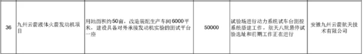 九州云箭液体火箭发动机项目建设内容和规模:用地面积约50亩,改造装配生产车间6000平米。总投资:50000万元项目进展情况:试验场进行动力系统试车台测控系统搭建工作,航天八院悬停试验选址和前期工作正在进行;