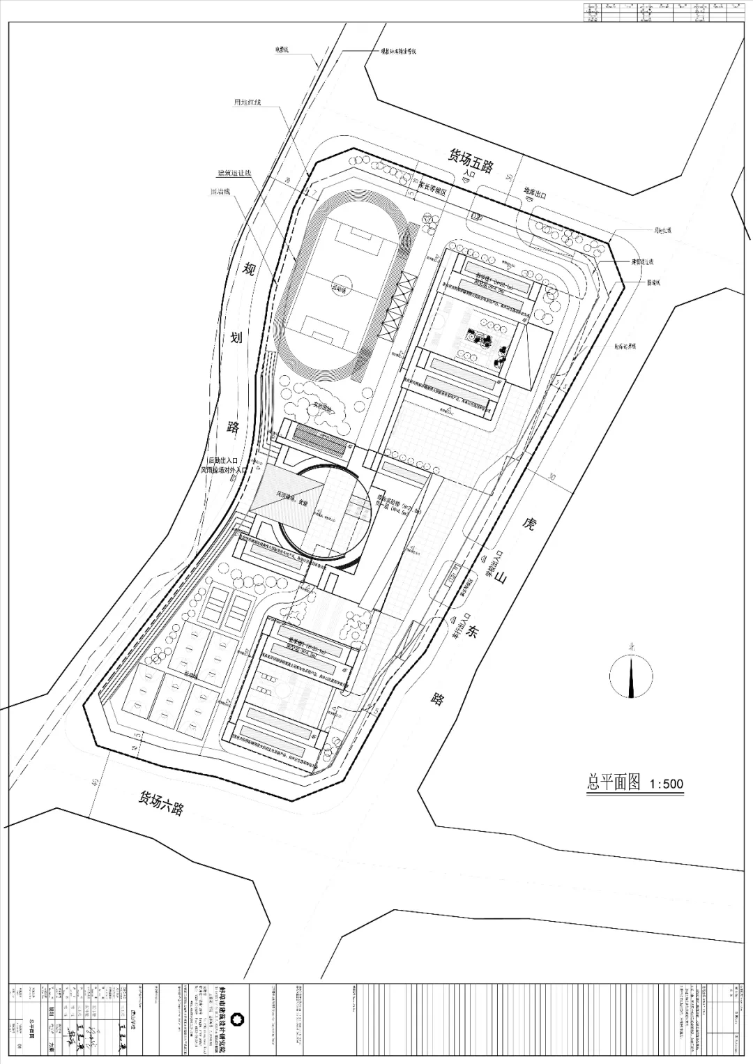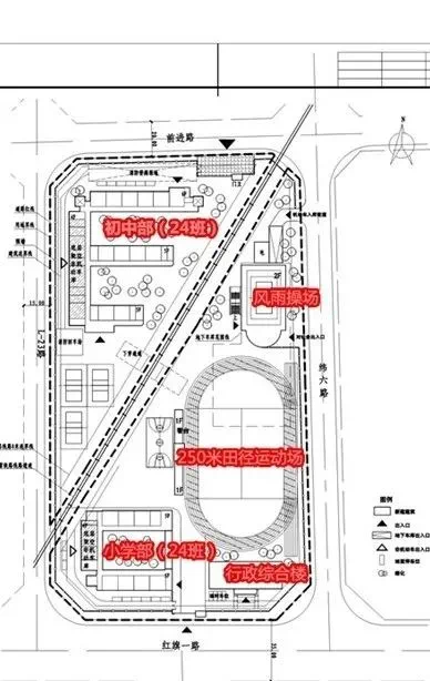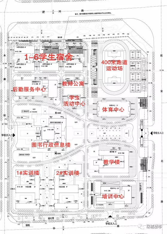 从规划图上看出,该校规划有6栋学生宿舍、以及教学楼、实训楼、培训中心、体育中心、学生活动中心、400米跑道运动场等相关设施;