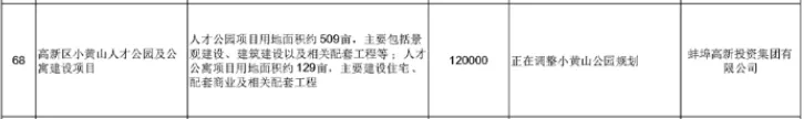 高新区小黄山人才公园及公寓建设项目建设内容和规模:人才公园项目用地面积约为509亩,主要包括景观建设,建筑建设以及相关配套工程等,人才公寓项目用地面积约129亩,主要建设住宅配套商业及相关配套工程;总投资:120000万元项目进展情况:正在调整小黄山公园规划;