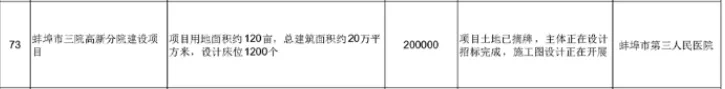 蚌埠三院高新分院建设项目建设内容和规模:项目用地面积约120亩,总建筑面积约20万平方米,设计床位1200个;总投资:200000万元项目进展情况:项目土地已摘牌,主体正在设计招标完成,施工图设计正在开展;