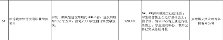 蚌埠城市轨道交通职业学院项目建设内容和规模:学院一起规划建设用地约为334.3亩,建筑用地约19万平方米,满足7000学生的日常教学规模;总投资:120000万元项目进展情况:1#、2#实训楼已出地面,学生宿舍楼正在进行基础施工,学生活动中心、教师公寓已完成基础开挖;