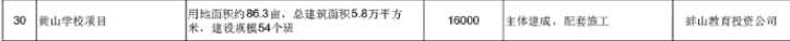 黄山学校项目建设内容和规模:用地面积约86.3亩,总建筑面积5.8万平方米,建设规模54个班总投资:16000万元项目进展情况:主体建成,配套施工;