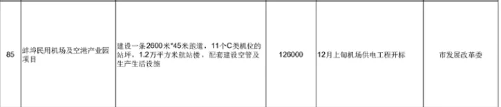 蚌埠民用机场及空港产业园建设内容和规模:建设一条2600米*45米跑道,11个C类机位的站坪,1.2万平方米航站楼,配套建设空管及生产生活设施;总投资:126000万元项目进展情况:12月上旬机场供电工程开标;
