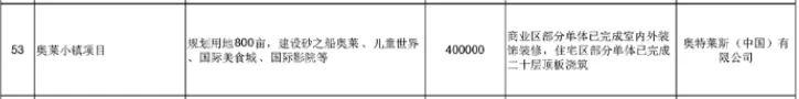 奥莱小镇项目建设内容和规模:规划用地500亩,建设砂之船奥莱、儿童世界、国际美食城、国际影院等;总投资:400000万元项目进展情况:商业区部分单体已完成室内外装饰装修;住宅区部分单体已完成二十层顶板浇筑;