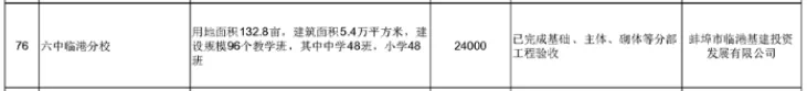 六中临港分校建设内容和规模:用地面积132.8亩,建筑面积5.4万平方米,建设规模96个教学楼,其中中学48班,小学48班;总投资:24000万元项目进展情况:已完成基础,主体,物体等分部工程验收;