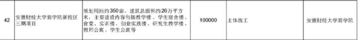 安徽财经大学商学院新校区三期项目建设内容和规模:规划用地约350亩,建筑总面积约26万平方米,主要建设内容包括教学楼、学生宿舍楼、食堂、实训楼、创业实践楼、研究生教学楼、教师公寓、学生公寓等;总投资:100000万元项目进展情况:主体施工;