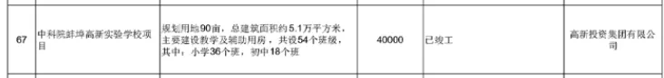中科院蚌埠高新实验学校建设内容和规模:规划用地90亩,总建筑面积约5.1万平方米,主要建设教学及辅助用房,开设54个班级,其中:小学36个班,初中18个班;总投资:40000万元项目进展情况:已竣工;