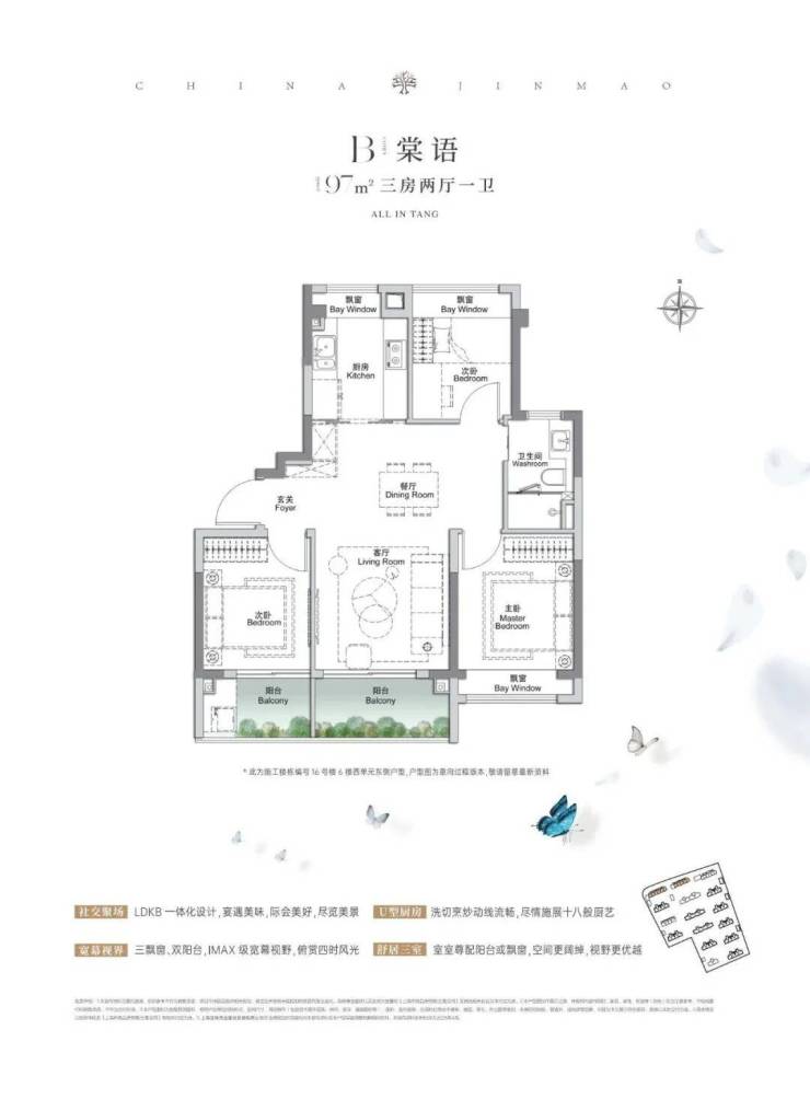 建面约97㎡3房2厅1卫,户型三开间朝南、再加上“3个飘窗+双面阳台系统”,不管是采光、视野、通风、私密性,还是实用性都十分出色。