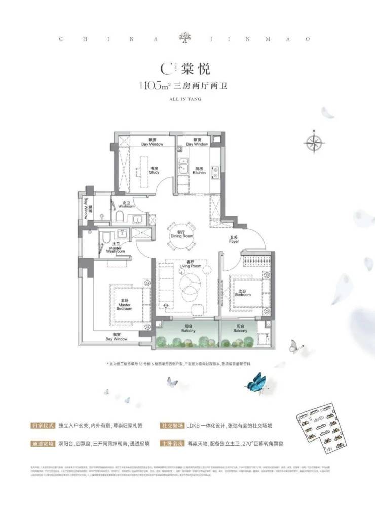 建面约105㎡3房2厅2卫,做到了三开间朝南+4个飘窗+双面阳台系统+主卧套房设计+270°转角飘窗,该户型的居住体验、舒适度、尺度感,是同级别产品所无法比拟的。