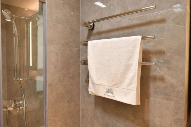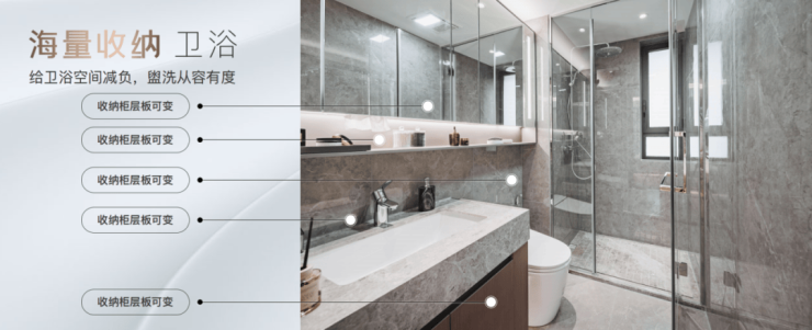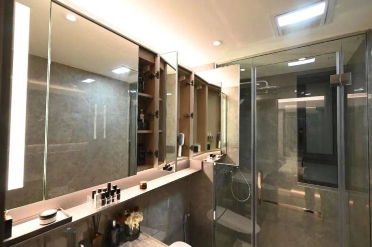 最后值得一提的是,项目还有很多个性化定制设计,包括防雾镜、美颜灯、电热毛巾架、岛台轨道插座(约93㎡户型)、预留美妆冰箱等。