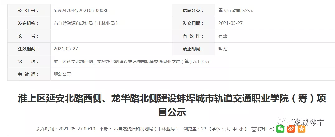 蚌埠市自然资源和规划局公布了蚌埠城市轨道交通职业学院项目规划公示;