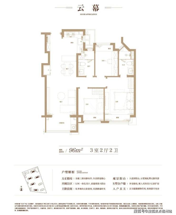建面约96㎡3房2卫户型,三开间朝南,全卧室带飘窗。整个户型的采光、视野非常出众。