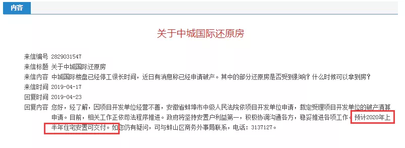 对于这样的致命三连击,官方回复:正在受理项目开发单位的破产清算。但是不用担心,安置户利益排名前列,预计2020年上半年安置可交付。意思就是开发商破产了,但是不耽误交房,安置户可以安心了。