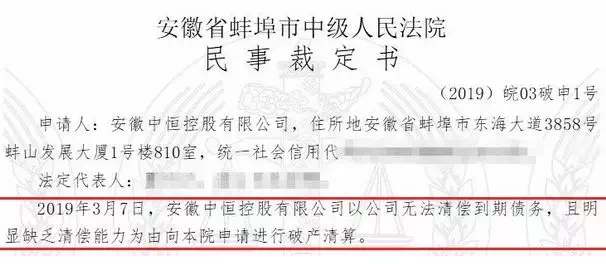 前不久蚌埠开发商—安徽中恒控股有限公司申请破产!