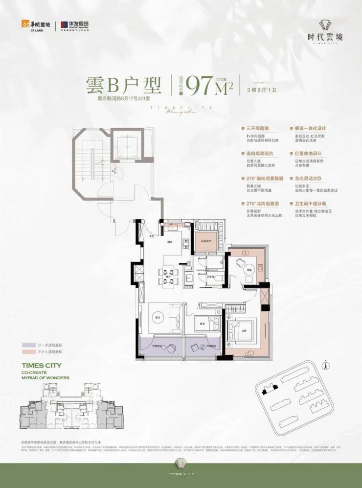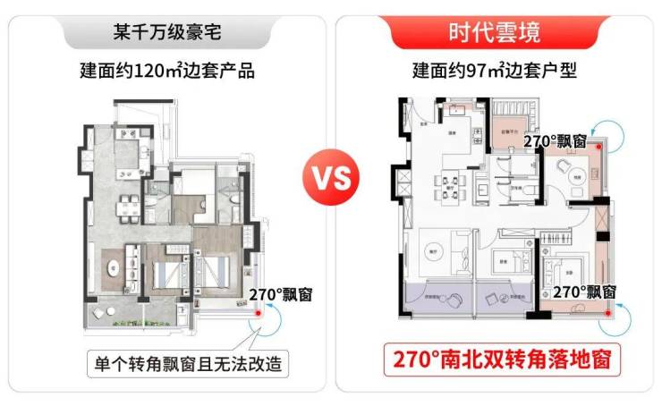 时代雲境建面约95-97㎡的房源不仅是边套,还设计了270°南北双转角落地窗。