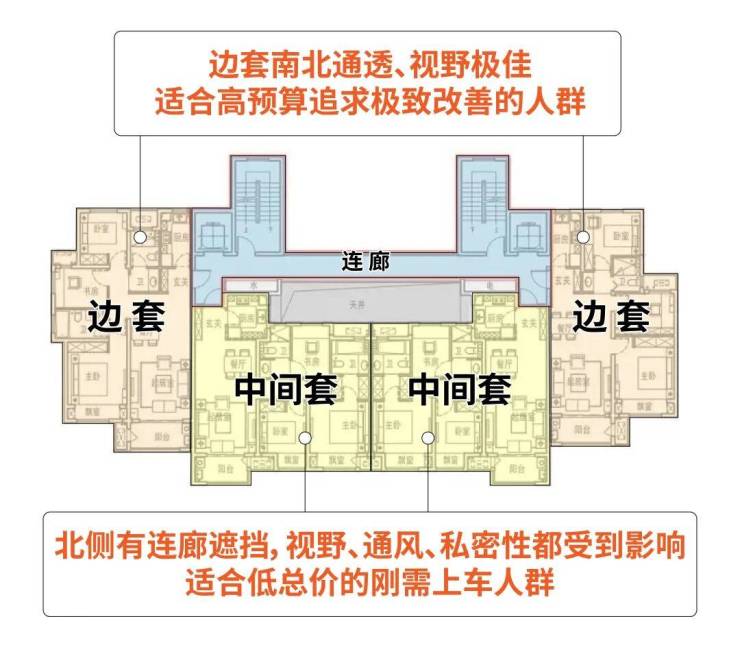 要知道,市面上9成的新房都是两梯四户,这意味着中间套的北侧就是连廊,采光、视野、通风效果很差,自然中间套就卖不上价格。