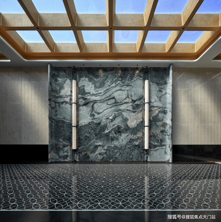 进入入户大堂后,映入眼帘的就是“万象山河”的奢石背景墙,独一无二的纹理,如此的大尺度,第一眼就够震撼,听说单这块石材就花了好几十万,绝对的大手笔。大堂内还配置了社区管家,刚进门就有贴心服务,尊贵感拉满。