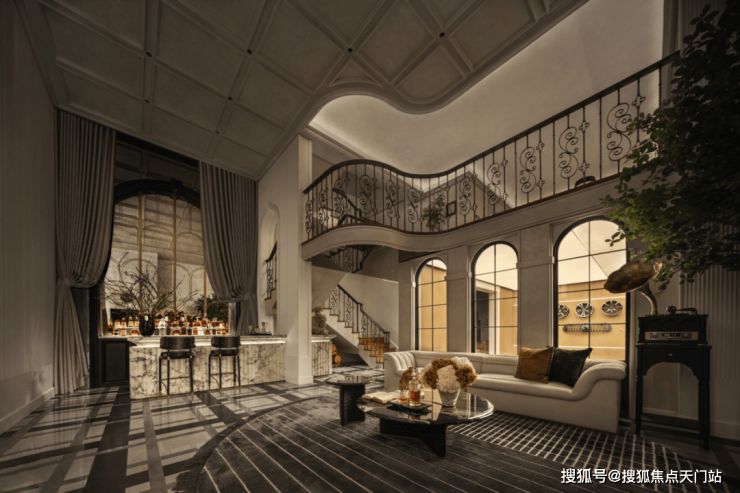 低密墅区为奢阔场景营造提供了先天优势。从大门开始,保利·外滩序的豪宅仪式感就扑面而来。据悉,在别墅组团单独设计了专属入户,给予业主“独一份”的尊崇感。入户两侧有两棵价值不菲的红花继木,春季变红,寓意“吉祥如意”。材质上也无不透露着贵气,立面是白玫瑰奢石,地面铺装的是慕尼黑大理石,顶部还特别运用了透光云石做了一个灯光设计,到了夜晚,灯光会穿透光云石洒向地面,很是惊艳。