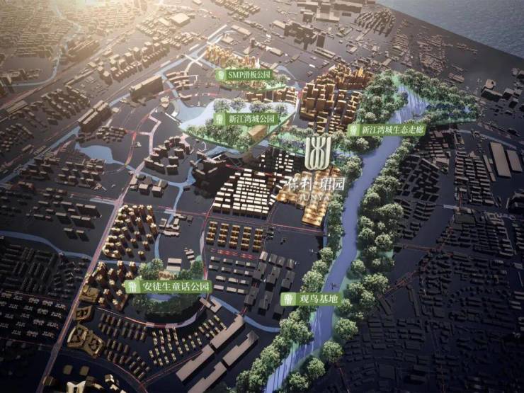除了低密,周边的生态环境也让人羡慕。项目西侧有约7.35万公顷的新江湾城公园,SMP滑板公园,安徒生公园,北侧和东侧是24万方的生态走廊,还有双河环绕。推窗见绿、枕水而居,这种体验在主城区真的很难得。