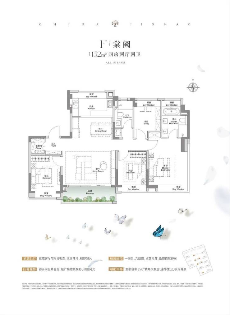 全景舱艺境美宅,标准层约3.1米层高、270度全景飘窗、LDKB一体化、南向跑道阳台、超12米南向全屏开间,无限视野尽收眼底,还有超金喜的满配精装,全上海只有央企金茂才能做得到。