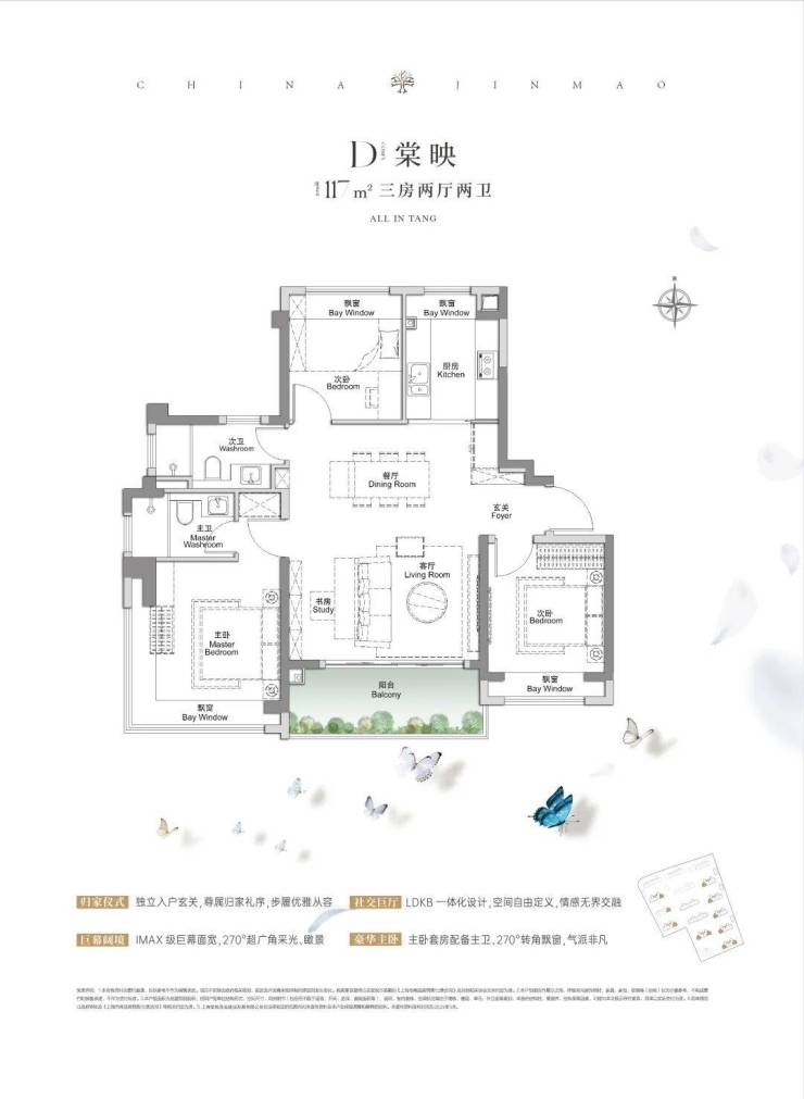 建面约117㎡3房2厅2卫,做到了3+1开间朝南+5个飘窗+主卧套房设计+270°转角飘窗,所有的尺度都有进一步提升。
