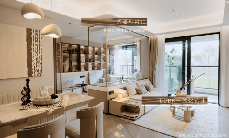 客厅空间也同样运用了更加舒展视觉的圆弧形吊顶和当下最受欢迎的LDBK一体化设计: