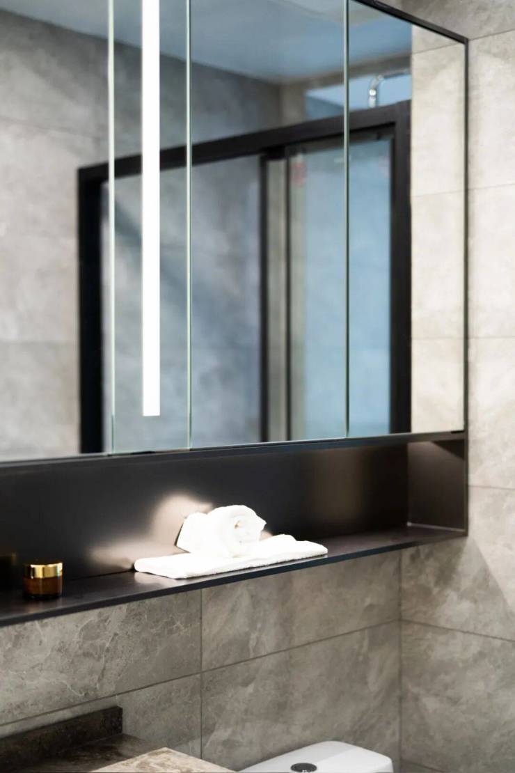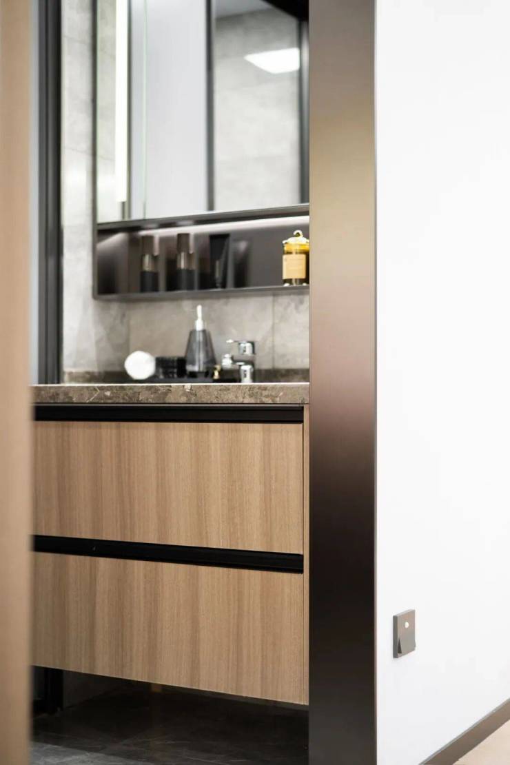 再比如,中央空调品牌升级成了日立;踢脚线升级为铝合金;就连主卫的镜柜,也升级成了整墙的布局;两个卫生间的台面到地面的过门石,也用了大理石做装点……