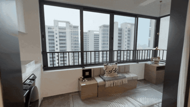 再比如客厅南面就是一个直接延伸到次卧的大阳台,甚至客厅和次卧之间还没有承重墙,发挥的空间很大。