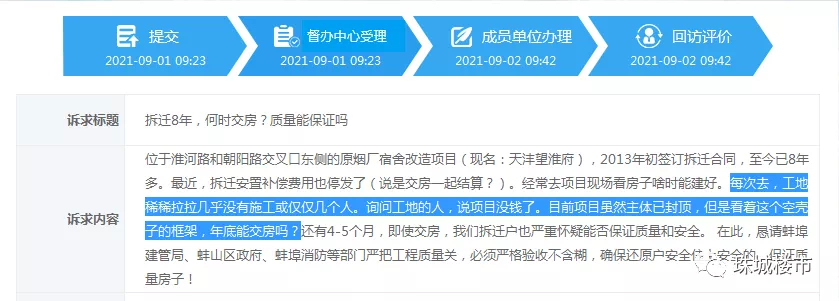 位于淮河路和朝阳路交叉口东侧的原烟厂宿舍改造项目(现名:天沣望淮府),2013年初签订拆迁合同,至今已8年多。最近,拆迁安置补偿费用也停发了(说是交房一起结算?)。经常去项目现场看房子啥时能建好。每次去,工地稀稀拉拉几乎没有施工或仅仅几个人。询问工地的人,说项目没钱了。目前项目虽然主体已封顶,但是看着这个空壳子的框架,年底能交房吗?还有4-5个月,即使交房,我们拆迁户也严重怀疑能否保证质量和安全。在此,恳请蚌埠建管局、蚌山区政府、蚌埠消防等部门严把工程质量关,必须严格验收不含糊,确保还原户安全住上安全的、保证质量房子!
