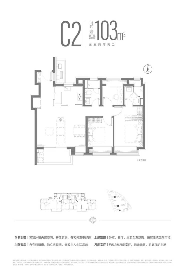 建面约103m²三房两厅两卫户型,南北双卧L型270°揽境飘窗设计,更大限度地让自然融入与自在之中,更宽阔的空间尺度,让自在生长与自然之中。