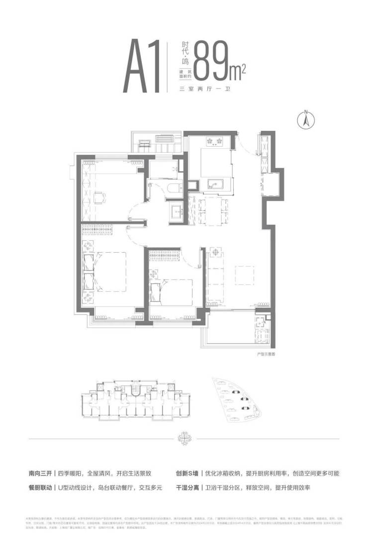 建面约89m²三房两厅一卫户型,LDKB一体化设计,南向三开间布局,全明空间设计。让四季流转于生活之中,用自然营造生活的惬意。