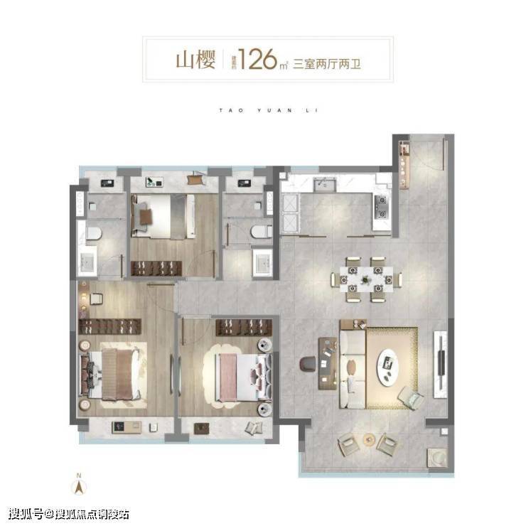 106㎡3房则做到“真三房”,不是市面的“2+1”,而是每个房间都能做卧室;约3.45米客厅面宽、开放式可视厨房、南向大阳台,让家庭公共活动空间更显开阔。