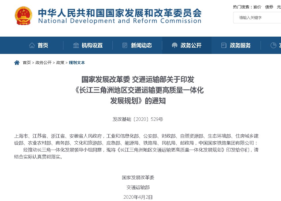 4月27日,国家发改委网站公布了《长江三角洲地区交通运输更高质量一体化发展规划》全文。