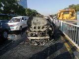 11月11日上午,在东海大道与朝阳路交叉口附近,一辆在东海大道上行驶的私家车突然发生自燃,火花飞溅引燃后一辆车,导致两车先后起火,所幸车上人员逃离及时,现场无人员受伤。